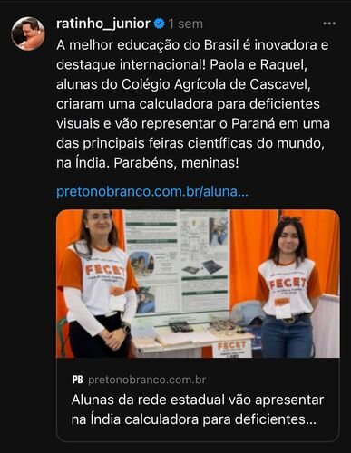 Abaixo há uma publicação do Governador do Estado do Paraná em sua rede social , parabenizando-nos. Embora o fomento esteja sendo protocolado também para solicitar recurso da mantenedora e do governo estadual para as alunas, se faz necessário a solicitação por meio de vakinha e para subsidiar a nossa participação como protagonistas do projeto, sendo alunos e professores da rede.