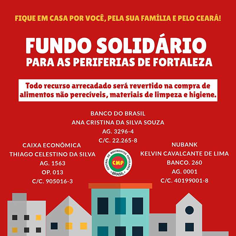 É necessaŕio criar um clima de solidaridade para que as periferias não fiquem ao relento nesse período e possa realizar o isolamento social com dignidade. Nesse sentido, a CMP-Ceará realiza uma campanha de arrecação de recursos que serão utilizados para compra de cestas básicas, produtos de limpeza e higiene para milhares de pessoas das periferias da cidade de Fortaleza/CE.