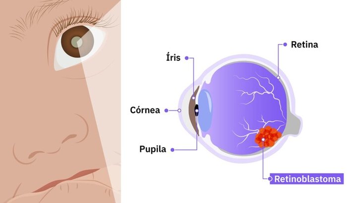 Retinoblastoma é câncer da retina que ocorre mais comumente em crianças < 2 anos de idade. Os sinais e sintomas geralmente incluem leucocoria (um reflexo esbranquiçado na pupila), estrabismo e, com menor frequência, inflamação e visão prejudicada.