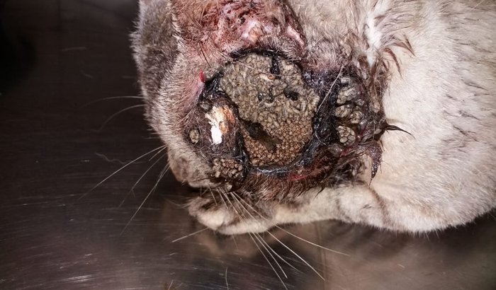 Vakinha feita para ajudar nas despesas de internação, tratamento e cirurgia de um gato resgatado muito machucado