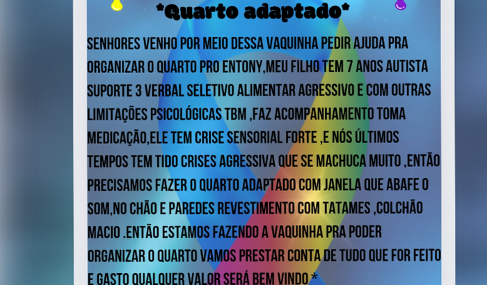 Senhores venho aqui por meio dessa vaquinha pedir ajuda pra organizar o quarto adaptado para o Entony ,meu filho tem 7 anos autista suporte 3 verbal seletivo alimentar e agressivo tendo tbm outras comorbidades dentro do espectro.