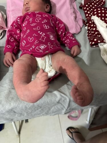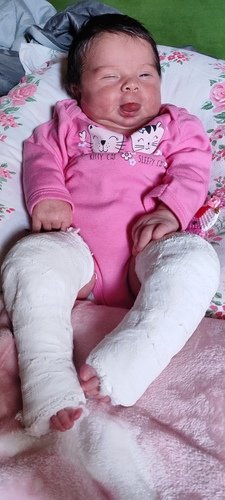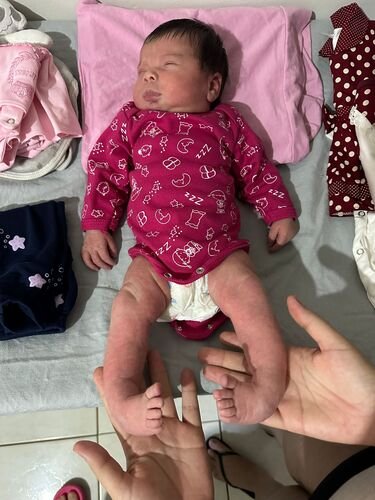 Olá!! Me chamo Paula, sou mãe da pequena Heloíse que nasceu a 8 dias (24/07). Ela é uma princesinha que nasceu com pé torto congênito. Moramos numa cidade no interior de MS, aqui não tem o tratamento necessário pra ela pelo SUS, apenas no particular. Esse tratamento é feito com gesso durante quase um ano e depois o uso de bota ortopédica, caso a correção não dê certo nesse método, aí apenas com cirurgia. O gesso tem q ser trocado toda semana, a cada troca é 400,00, e cada raio-x é 95,00. Infelizmente não tenho condições de arcar com esse valor toda semana, meu esposo recebe um salário mínimo e eu recebo um salário comercial apenas, pagamos aluguel, contas, mercado. Estamos recorrendo a essa ajuda para que nossa filha faça esse tratamento de imediato para poder ter um futuro normal e sem necessidade de cirurgia.