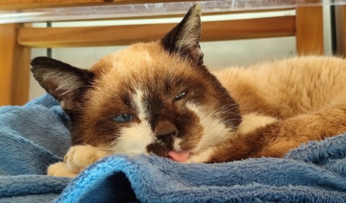 De uns tempos pra cá apareceu um gato Sialata (Siamês com vira-lata) aparentando ser idoso, muito magro, com gripe, respiração difícil e implorando por comida.
