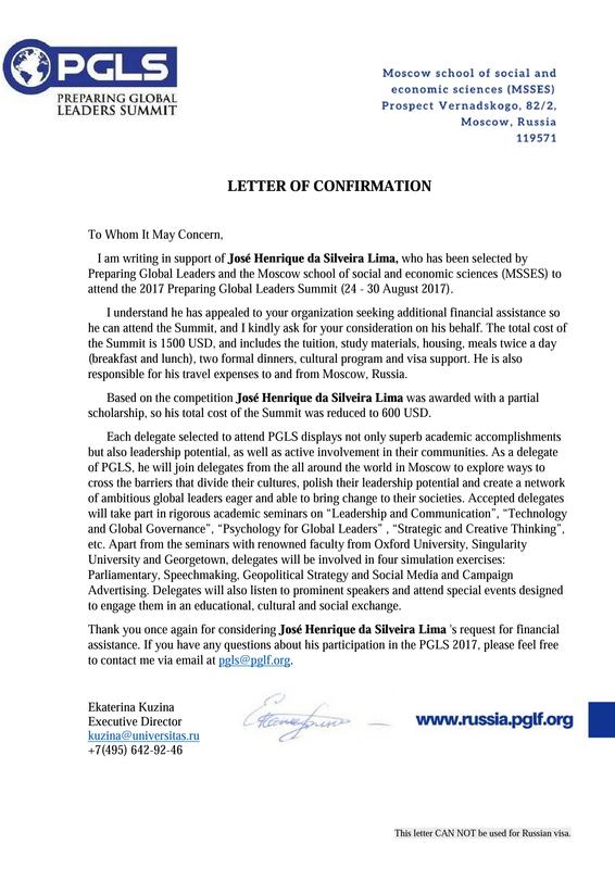 Fui aprovado em um programa internacional de liderança chamado Preparing Global Leaders Summit oferecido pela Universidade de Ciências Sociais e Econômicas da Rússia (MISSES), ocorrerá em Moscou na Rússia com duração de uma semana. O programa seleciona e prepara jovens de diversos lugares do mundo que desejam se tornar líderes em seus países e lá terei a oportunidade de assistir aulas de liderança com professores das universidades de Oxford, Georgetown e Singularity, reconhecidas mundialmente na área, e debater sobre governança global com jovens de diferentes culturas. Fantástico, não?