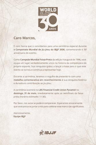 Esse ano completa 30 anos que foi campeão e a IBJJ irá fazer uma homenagem a todos os campeões mundiais e o mestre Marcos Luís Barreto lima nos poderia ficar de fora