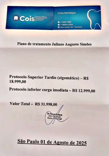 Informo que todo o tratamento que for sendo realizado na COIS - CONSULTÓRIO ODONTOLÓGICO INTEGRADO SANTANA estarei apresentando aqui notas fiscais ou recibo para que tudo fique ao extremo comprovado de que sua ajuda está dando certo e que no final eu e você sairemos vitoriosos deste drama que atravesso por anos.