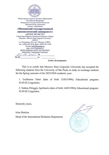 Carta de confirmação da internacionalização pela Universidade Estadual Linguística de Moscou: