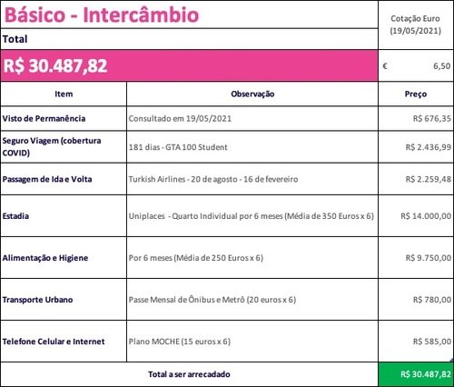 O foco principal é a Vakinha Online, que vai arcar com os custos básicos de 6 meses de intercâmbio. Estou pedindo apenas R$ 20.709,54, que serão utilizados para custear os primeiros gastos como visto, passagens, seguro e hospedagem! como o visto, as passagens, o seguro internacional e a estadia.