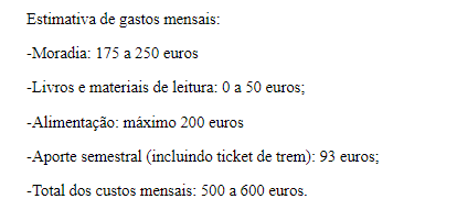 Total: aproximadamente 500 euros por mês para me manter. São 5 meses de curso: 2,5 mil euros.