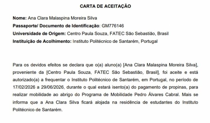 Olá! Meu nome é Ana Clara, sou estudante da FATEC São Sebastião e fui selecionada para um intercâmbio acadêmico em Portugal, no Instituto Politécnico de Santarém.