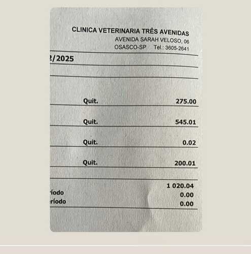 Já gastamos cerca de 1.020 reais contando consulta, exame de ultrassom, exame de sangue, medições como cerenia, vitaminas e também os gastos da internação.