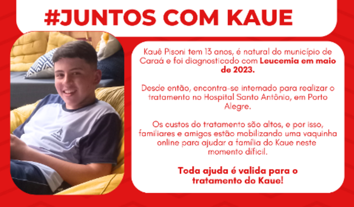 Kauê Pisoni tem 13 anos, é natural do município de Caraá e foi diagnosticado com LEUCEMIA em maio de 2023.