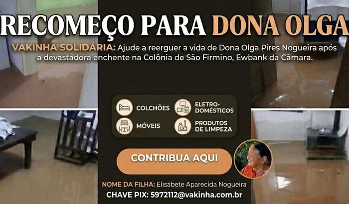 Estamos unindo forças em uma corrente de solidariedade para apoiar a Dona Olga Pires Nogueira, moradora da Colônia de São Firmino, no distrito de Ewbank da Câmara.