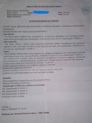 Recentemente, uma ultrassonografia revelou a presença de três nódulos na minha tireoide. Eles foram classificados em diferentes graus de risco, sendo um deles TI-RADS 5, o que significa alta suspeita de malignidade. Por isso, preciso fazer uma biópsia com urgência para ter um diagnóstico preciso.