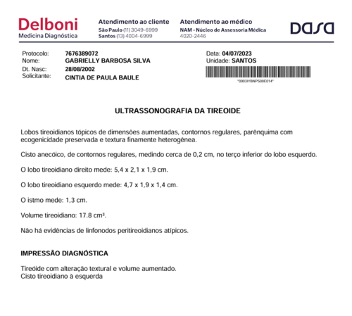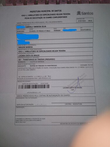 Quando finalmente consegui o exame este ano, recebi a notícia dos 3 nódulos e a classificação de risco que me deixou em alerta. Com o encaminhamento para a biópsia em mãos, entrei na fila de espera do SUS. A resposta que tive é que preciso aguardar eles me ligarem, sem nenhuma previsão de data.