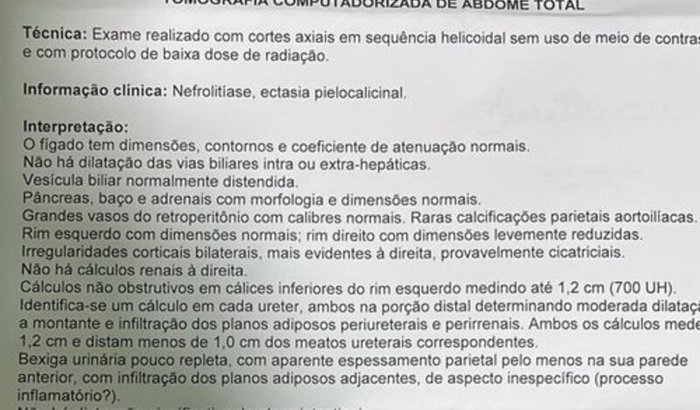Ele já vinha em tratamento por um problema na bexiga, que trouxe grandes custos com medicamentos e cuidados contínuos. Agora, infelizmente, surgiu uma nova complicação: pedras nos rins e obstrução nos ureteres, que estão comprometendo o funcionamento renal e exigem uma cirurgia urgente para evitar danos irreversíveis.