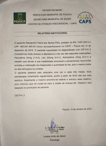 Toda a documentação comprova que ele necessita de tratamento especializado em saúde mental e de acompanhamento intensivo em clínica adequada.