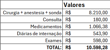 Como os custos são bem altos (gastamos quase 11 mil), gostaria de pedir a sua ajuda, contribuindo (se puder) com qualquer valor (que já é de grande ajuda) e compartilhando para que mais pessoas possam ajudar minha família também.