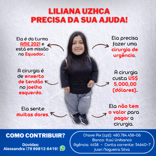 No ano de 2021 ela veio para o Brasil para participar do AME (Aventureiros em Missões Evangelísticas), que é um programa missionário da igreja de Cristo. Então, logo após finalizar o treinamento aqui no Brasil ela foi enviada para o seu campo missionário na cidade de Tabacundo, no Equador, onde está agora, por isso a cirurgia será paga em dólar, pois é a moeda usada no país.