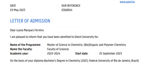 At UGent (as the university is known) I intend to do a Masters in Chemistry while taking classes on business and sustainable development (being a world leader in the field). The institution is a reference in research in chemical sciences, ranked 2nd in the list of best universities in Belgium. In addition, the university is among the top 100 in the world (Academic Ranking of World Universities Shanghai Ranking 2022). In this way, I hope to contribute with my knowledge in research and innovation for the sustainable development of society.