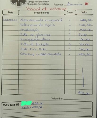 Porém, sozinha, minha amiga Paolla não irá conseguir arcar com as minhas despesas médicas e precisa de uma ajudinha. Atualmente minhas dispesas médicas estão próximas a R$1.000, mas terei que ficar internado até, no máximo, dia 08/08 (segunda-feira), chegando próximo a R$ 1.200. Segue os custos parciais do meu internamento até dia 05/08: