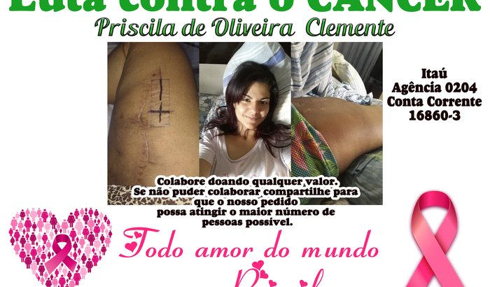 Meu nome é Priscila de Oliveira Clemente, 32 anos e desde 2016 luto contra um n câncer no músculo da coxa direita (lipossarcoma grau 3). Descobri após emagrecer 40kg e fazer pelo SUS uma cirurgia plástica reparadora nas coxas para retirada de excesso de pele. A cirurgia plástica foi em maio/2016, em julho/2016 em pós cirúrgico volto ao médico e mosto uma bola pequena próximo a virilha. Após, ressonância magnética o laudo apresenta “hematoma?”. Então, o cirurgião plástico sem se aprofundar em outros exames, fala que meu organismo irá absorver e sou liberada para trabalho. Em novembro /2016 volto ao cirurgião plástico que verifica a bola do mesmo jeito e marca uma cirurgia de drenagem sem raspagem do “hematoma”. Em janeiro/2017 20 dias após a cirurgia de drenagem a bola de 10 cm começa a crescer ficando praticamente o dobro do tamanho e o cirurgião diz ser normal (fibrose). Desconfiada começo a buscar outros médicos pelo plano de saúde da empresa . Alguns não quiseram mexer em algo de outro médico, até que no início de março/2017 um cirurgião geral pede nova ressonância e o “hematoma" era um possível tumor maligno. Sou encaminhada à um ortopedista oncologista cirurgião que me encaminha ao Into para fazer biópsia, pois ele não aceitava meu plano e eu não tinha dinheiro para pagar. Em abril /2017, faço biópsia no INTO e em maio/2017 O resultado, realmente um tumor maligno. No dia do meu aniversário 28/06/2017, retiro um tumor de 20cm com quase 3kg e perco um pedaço da minha artéria femoral reconstruída por uma veia safena. Sou encaminhada para radioterapia, pois esse tipo de tumor é raro afetando 1% apenas da população mundial e quimioterapia não tem efeito, radioterapia somente em micro células, ou seja, não conseguiram retirar o tumor com tecido saudável nas margens. Sou submetida a 35 sessões de radioterapia que terminam em novembro/2017. Com chance de 80% de retorno nos 2 primeiros anos, em janeiro /2018 sou submetida a exames trimestrais e em fevereiro/2018 novo tumor é detectado no mesmo lugar colado ao osso com média de 7cm. Encaminhada ao cirurgião oncológico novamente, me informa que precisaria retirar toda a perna como a melhor chance de salvar minha vida e mesmo assim eu teria 80% de chance de reincidir em outro lugar do corpo, mesmo sem metástases. Abalada tento suicídio. Após, consultas psicológicas resolvo lutar, faço muitas orações e pesquisas. Encontro uma substância em tarte chamada fosfoetanolamina sintética, no qual só se consegue com ação judicial. Consigo uma advogada e ganho o direto de compra pela PDT PHARMA (SP), porém, só vendia a substância e eu teria que encapsular em outro lugar de confiança. Venho para o RJ faço rifas para conseguir estoque da substância (R$ 270,00) e (R$ 45,00 encapsular) pois uma vez que começa o tratamento não pode ser interrompido, porque o efeito rebote é agressivo e o tratamento é de um ano ou mais. Em maio/2018 começo o tratamento com 1 substância, sendo necessário um completo de vitaminas para reforçar o sistema imunológico que custa em torno de R$ 800,00. Tenho uma melhora significativa. Em junho/2018, volto a SP com o dinheiro da rifa e compro mais 5 substâncias (5 meses), 3x ao dia. Para não parar o tratamento mando encapsular 90 comprimidos em SP, em uma farmácia de manipulação não conhecida, mas indicada e ao voltar ao RJ mando fazer 360 cápsulas onde havia feito em maio/2018 com bom resultado. Em 15 dias tomando as cápsulas feitas em SP, o tumor começa crescer absurdamente, a ponto de eu não conseguir mais andar, tendo que pagar carro para locomoção, passo a ficar com minha mãe, antes eu morava sozinha. E no dia do meu aniversário, após conversar com Deus vejo na internet que cápsulas de fosfo estão sendo falsificada e que essas teriam reação ao iodo deixando -o azulado. Faço o teste com as cápsulas de SP e RJ, Para minha surpresa as de SP tiveram reação e daí o motivo para o crescimento do tumor acelerado, chamado efeito rebote. Muito triste, converso com minha advogada e estamos para perícia e começo a tomar as pílula do RJ que me fazem começar a caminhar. Porém, agora tomo 5x ao dia e os suplementos vitamínicos mudaram. Com tanto gasto estou sem dinheiro para continuar o tratamento e com muitas dores. Peço ajuda aos amigos e estou aqui pedindo sua ajuda também. Todos os meus exames estão aqui assim como as receitas. Mediante muita tristeza torno minha doenças pública, até onde eu pude escondi de muitas pessoas, por não querer ser vista com piedade. Agora não tenho mais escolha ou me torno deficiente com 80% de chance de ter a doença novamente ou tento esse tratamento alternativo para me curar por completo. Muito obrigada por sua ajuda.