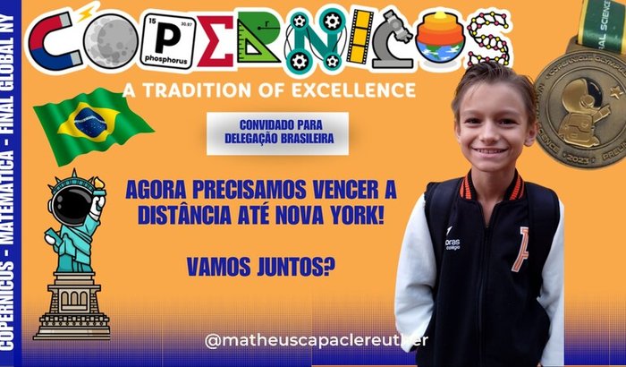 Este ano, fui classificado para a fase final da Copernicus Math Olympiad, uma das maiores competições internacionais de matemática, que aconteceu em Nova York no final de julho (texto segue abaixo). Infelizmente, não consegui participar, apesar de todo o esforço da minha família, não conseguimos arrecadar o valor necessário a tempo.