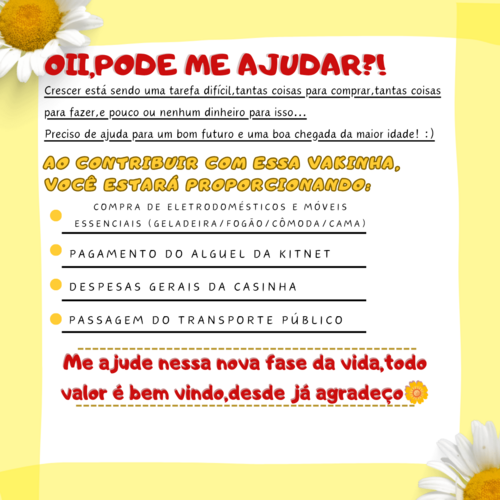 Oii,meu nome é Laura,estou a poucos meses de completar 18 anos e quero arrecadar dinheiro para poder finalmente conquistar uma casinha :).