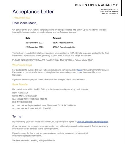 Eu me chamo Maria Clara, sou cantora lírica e recebi a notícia de que fui selecionada para participar da Academia de Ópera de Berlim! Cantar uma ópera na Alemanha é a realização de um sonho e uma oportunidade incrível para desenvolver minha carreira. Porém, o valor do curso é muito alto e os prazos muito curtos. Sou grata a todos que puderem contribuir com qualquer valor! ❤️