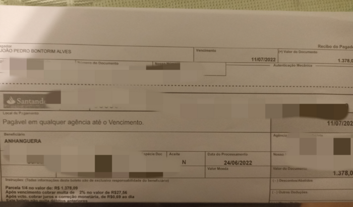 Pois bem, quando entrei fiz a matrícula no esquema PEP que é tipo o Fies deles, e agora chegou aquele momento tenso, 4 parcelas de 1378,09 totalizando R$ 5512,36.