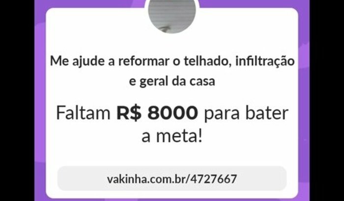 me ajude a consertar o telhado, a infiltração, e fazer uma geral na minha casa, por favor, não tenho condições e não posso perder o que tenho, esse período chuvoso está muito complicado pra mim. agradeço a todos que puderam ajudar.PIX