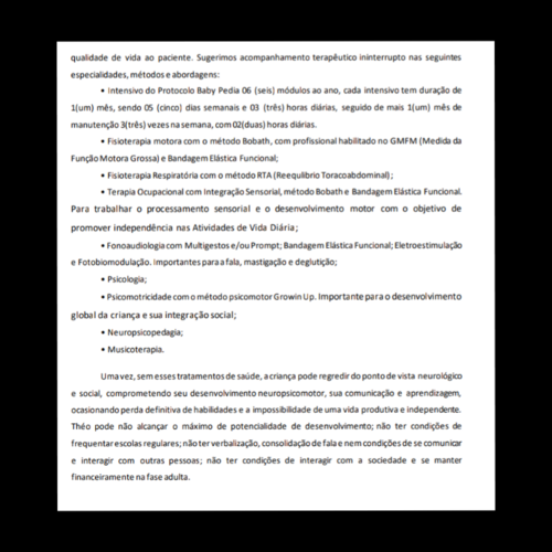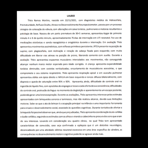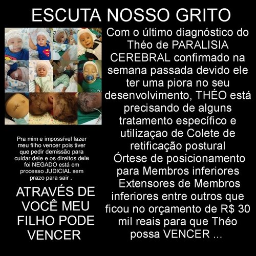 Oi, eu sou Theo, tenho apenas 1 aninho. Apesar de ser tão novo, a minha trajetória de vida não foi e nem é nada fácil. Eu nasci com 7 meses e os meus pulmões eram muito fraquinhos, assim, tive que ser reanimado e entubado. Pelo fato de precisar de muito oxigênio acabei tendo uma hemorragia intracraniana que me fez desenvolver uma hidrocefalia. Mas mesmo com todas as dificuldades lutei pela minha vida, consegui ter alta aos 3 meses, e, desde então, minha mãe vem lutado por mim e pela minha saúde. Por conta da hidrocefalia, tive que passar por três cirurgias cerebrais e na última cirurgia, colocaram uma valvula para que pudesse drenar o líquido que cresce em minha cabeça. Por conta de todas essas complicações desenvolvi outra doença que me faz precisar de oxigênio em alguns momentos porque perco o controle do meu. Acabei por desenvolver também uma paralisia cerebral, que, infelizmente, não tem cura, logo, terei que conviver com ela pelo resto de minha vida. E para ter uma vida mais tranquila, preciso tratar de forma continua. Assim, com a luta da minha mãe e de meu pai, tive acesso a um convênio que cobria a minha fisioterapia que preciso fazer todos os dias. Mas por ser uma grande demanda, o convênio bloqueou o meu acesso. Assim, tentei recorrer a justiça, mas nesses 30 dias que precisei ficar sem me tratar, toda a evolução que tinha conquistado eu perdi. Logo, comecei a realizar uma série de exames para tentar entender o porquê dessa regressão absurda, mas ainda não conseguimos descobrir. Tentei conseguir o benefício BPC/loas, o qual é um auxílio assistencial para pessoas como eu, que não tem condições de arcar com tantos tratamentos, ainda mais pelo fato de minha mãe não poder trabalhar, pois sou totalmente dependente dela, assim, preciso de seus cuidados de modo integral. Porém, mesmo preenchendo todos os requisitos, o benefício foi negado. Então minha mãe recorreu à justiça, entretanto, ainda não há nenhuma decisão. Meu pai recebe só um salário-minimo e todo esse recurso é dedicado à casa para que possamos ter onde morar. Logo, meus pais não tem condições de arcar com todos os tratamentos e exames que preciso realizar de modo constante por conta da condição que nasci. Infelizmente, preciso de muitos recursos os quais não tenho acesso, como medicamentos caros e um colete para sustentar minha coluna. Então por isso peço ajuda de todos que puderem, seja compartilhando, seja doando, seja pedindo por justiça, pois afinal, não pedi para vir assim, mas também não irei desistir de lutar para estar aqui. Minha condição me torna mais frágil do que a maioria das pessoas, mas não me torna menos humano, não me torna menos digno, afinal, mesmo com todos os empecilhos, tenho pessoas que me amam e lutam por mim, ainda que seja com tanto sacrifício. Então, por isso, decidi contar um pouco da minha história. Afinal, apesar de ter apenas 1 aninho, eu não desisti de lutar.