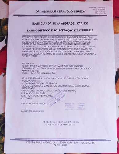 O médico recomendou a Cirurgia de Artroplastia Total do Quadril, pois os ossos dessa articulação desgastaram totalmente. O custo da cirurgia foi orçado em R$100,000,00 em 2020. Sem condições financeiras para procedimento particular ou plano de saúde, decidimos entrar com ação judicial, mas o processo está parado desde 2021, na Comarca de Casa Nova-Ba, aguardando despacho.