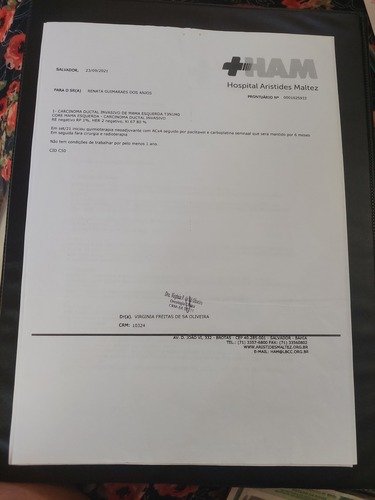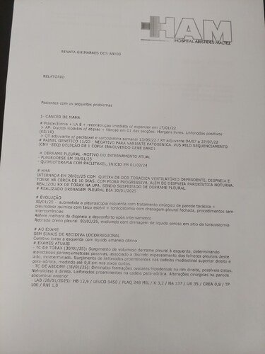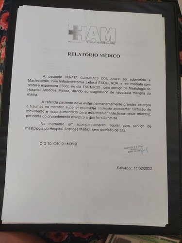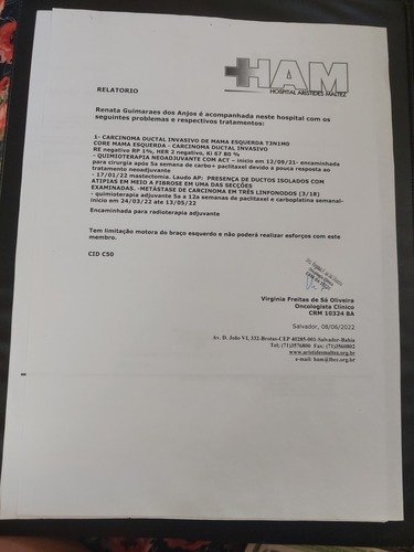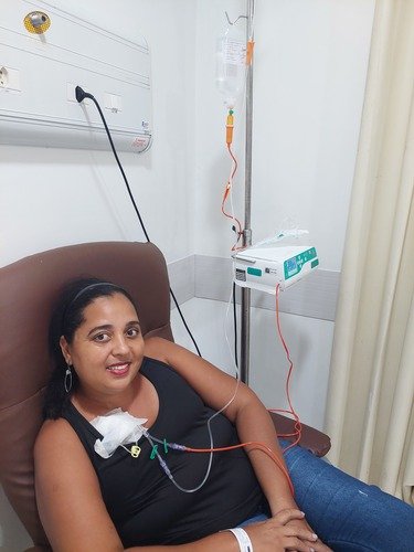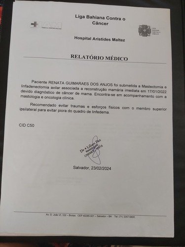 Eu me chamo Renata Guimarãe dos Anjos e minha luta começou em 13/07/21, quando descobri que estava com câncer de mama, fiz a primeira mastectomia em janeiro de 2022 seguida de quimioterapia e radioterapia, acompanhada pelo HAM - Hospital Aristides Maltez. Salvador. BA. descobri em 2024 um novo tumor na esquerda onde fiz tb a segunda mastectomia mas apenas agora em 17/01/25 veio outro diagnóstico após sofrer um derrame pleural infelizmente o câncer disseminou e estou com Metástase no pulmão, hoje sigo em tratamento com quimioterapia , peço ajuda para seguir o tratamento o custo do meu traslado é muito alto. Pois não moro na Capital (Salvador Bahia ) e sim na Ilha de Itaparica, município de Vera Cruz BA ,onde tenho que pegar transporte marítimo com valor alto , onerando demais na renda familiar. A qual recebo um pequeno benefício e o salário do esposo que é para todas as demandas domésticas/familiares. Ao chegar em Salvador ainda pego outro transporte para o hospital , tenho sessões de quimioterapia e fisioterapia toda semana além exames para diagnósticos que tenho que fazer a cada 3 meses e hoje não posso esperar pelo sus nem regulação cada minuto é crucial para minha vida sigo com fé que vou vencer mais esta batalha é contra o tempo e conto com a ajuda de vocês , sou mãe 2 filhas e quero muito ver elas se formarem 🥰 tenho força e fé que vou vencer está batalha .(O câncer não me define) Sou feliz e vou lutar até o fim ,segue abaixo algumas fotos e meus relatórios medicos 🙏.