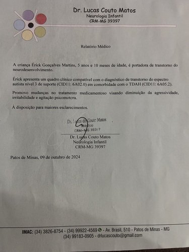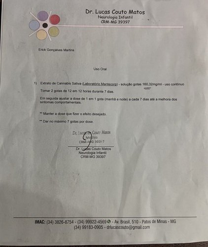 Erick é uma criança diagnosticado com TEA nível três além do cannabis ele precisa mas do resperidon,atentah,e o antesina,somos de família humilde moramos em um barraco somente de pai que trabalha a mãe fica por conta do filho,não recebemos ajuda do governo e este medicamento dura somente 15 dias ele custa 469,90 um frasco pequeno ele toma 9 gotas de manhã e 9 gotas a noite