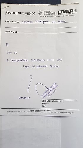 Na tentativa de salvar a vida de minha mãe, venho solicitar ajuda de todos e todas para custear conosco a compra de canetas de Teriparatida 250mcg/ml, medicamento de alto custo para nós e, ao mesmo tempo, nos negado pela Justiça. A paciênte acima, com múltiplas fraturas de punho, costelas, torácica e com evolução para femural, corre risco de morte com a falta desse medicamento, segundo laudo médico. Obrigada a todos e todas.