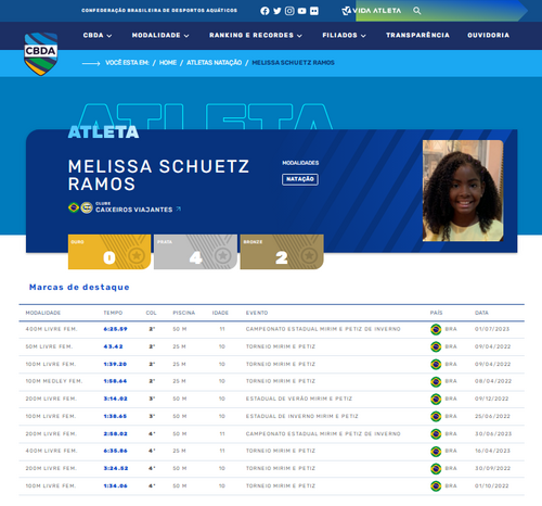 Atleta Federada a FGDA (Federação Gaúcha de Desportos Aquáticos) e filiada a CBDA (Confederação Brasileira de Desportos Aquáticos).