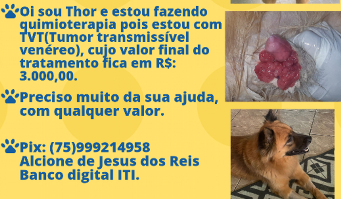 Oi me chamo Thor e esou fatendo quimio pois esou com TVT (tumor transmissível vulnerável), que tem um cisto total de R$: 3.000,00.