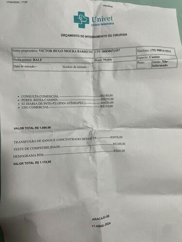Eu sou Victor, tenho 20 anos e estou criando essa vakinha para ajudar nos custos da internação + transfusão sanguínea do meu cachorro. Ele foi adotado por nossa família tem 4 meses e desde então estamos cuidando dele, ele sempre foi muito quieto, não tinha ânimo para nada, nós achávamos que isso era da personalidade dele e por ele ser idoso, mas hoje descobrimos que ele muito provavelmente está com a doença do carrapato e com uma anemia severa, ele irá precisar de transfusão e já está internado em uma clínica. Eu odeio fazer isso, mas essa situação é de extrema urgência, os gastos com consulta, diárias de internação foram R$ 1.060,00 e os gastos com transfusão serão R$ 1.110,00, estarei mandando os valores no anexo. Totalizando seria R$ 2.170. Porém, ele não tem previsão de alta, e ficará internado na clínica por um tempo, e a diária na clinica é R$210. Peço a ajuda de vocês para me ajudar a arcar com esses custos.