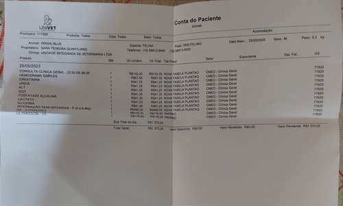 Vou tentar anexar foto dos exames, do valor total e fotos do meu gato que está internado ( a internação por ter ocorrido a noite é um valor ainda maior)
