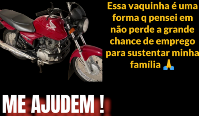 Eu sou André Lima , e crie essa vaquinha pois preciso arrecadar R$: 5.900,00 para comprar uma moto. Motivo qual necessito dela para começar trabalhar e sustentar minha família! Essa moto não é pra lazer e sim para trabalhar de Vendedor Externo essa oportunidade de emprego muito boa para recomeçar no meu interior. Pelo amor de Deus me ajudem com qualquer quantia🙏