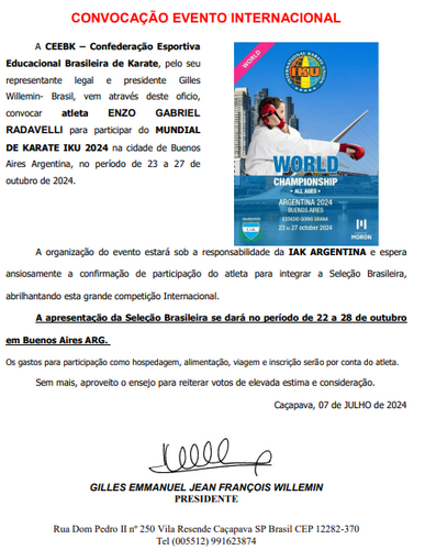 Eu sou Enzo Gabriel Radavelli atleta de Karatê de Indaial - SC, 10 anos, faixa roxa, praticante de Karatê deste os 5 anos de idade, Campeão Brasileiro, Campeão Estatual.