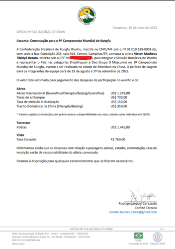 Faço parte da Seleção Brasileira de Kung Fu há 2 anos e esse ano fui convocado para representar o Brasil no 9º Campeonato Mundial de Kungfu, evento a ser realizado na cidade de Emeishan na China.