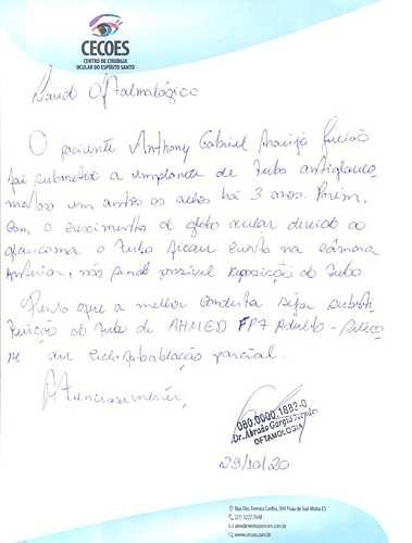 Olá meu filho nasceu com glaucoma congênito é antes de um ano precisou de implante de tubos em ambos os olhos. Mas agora devido os olhos dele crescer mais que o normal o tubo ficou curto sendo necessário asubstituição. Essa cirurgianao é realizada pelo sus, com isso meu filho está sofrendo muito. Já procurei secretaria de saúde, defensoria pública entre outros órgãos ms não obtive sucesso em nenhum. Com isso o tempo está passando e não vera meu filho neste sofrimento. Por este motivo venho aqui humildemente pEdir a ajuda de vcs, sou desesperada implorando pr ajuda. Vcs vão eencontrar tido sobre ele na página no fecc. #naodeixeoanthonyficarcego