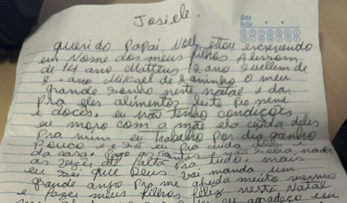 "Querido Papai Noel, estou escrevendo em nome dos meus filhos Alisson de 14 anos, Mateus 12 ano, Suellem de 8 anos e Micael de 2 aninhos. O meu grande sonho neste natal é dar pra eles alimentos, leite pro neném e doces. Eu não tenho condições. Moro com a minha mãe e ela cuida deles pra mim. Eu trabalho por dia, ganho pouco e só tem eu pra cuidar (sustentar) eles e a casa. Pago as contas e não sobra nada e as vezes até falta pra tudo!