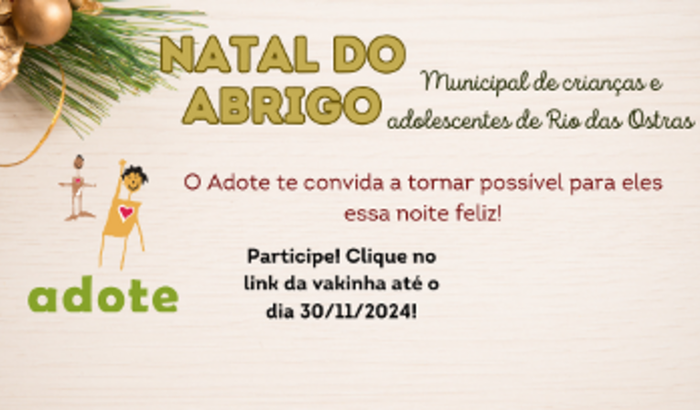 Todos os anos o ADOTE - grupo de apoio à adoção de Rio das Ostras realiza a festa de Natal das crianças e adolescentes institucionalizados no município de Rio das Ostras com a ajuda de doações espontâneas de parceiros e amigos da sociedade civil que abraçam a causa!Junte-se a nós em mais uma oportunidade de levar um Natal mais feliz para nossas crianças!Compartilhe! Divulgue! Participe!ADOTE - Há 17 anos lutando pela infância e juventude, acolhendo famílias no pré e pós adoção na cidade de Rio das Ostras.
