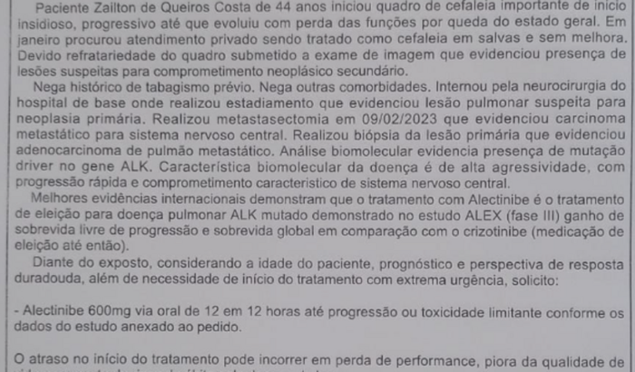 Estamos fazendo essa vaquinha com o intuito de arrecadar R$ 30.000,00 para adquirirmos o remédio Alectinibe de 600mg, para o Zailton de Queiros Costa, que foi diagnosticado com Neoplasia Maligna dos Brônquios e dos Pulmões)- tumor. A falta deste remédio para o início do tratamento, pode acarretar na piora da qualidade de vida e as chances de óbito.