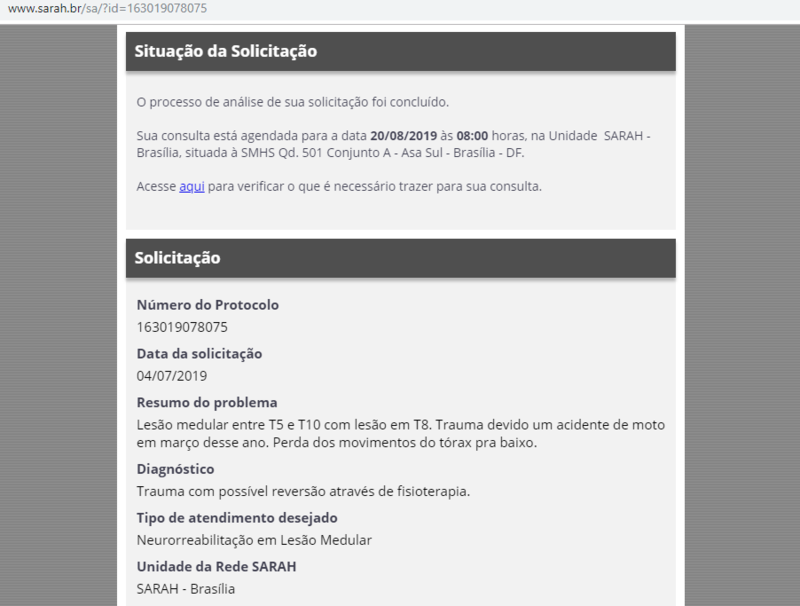 O diagnóstico deste trauma é com possível reversão através de fisioterapia e neurorreabilitação, por isso, vamos em busca de financiar esta viagem que tem como objetivo parte do tratamento. A Neurorreabilitação em Lesão Medular que a Tami precisa só é oferecida pela Rede SARAH na unidade de Brasília. O tratamento em si é gratuito conforme disponibilidade e já foi agendado a consulta para o dia 20/08/2019, conforme anexo final. A Tami atualmente está em Porto Alegre aos cuidados da família e por isso, os custos estimados partem deste local. São objetivo da meta financeira desta Vakinha:
