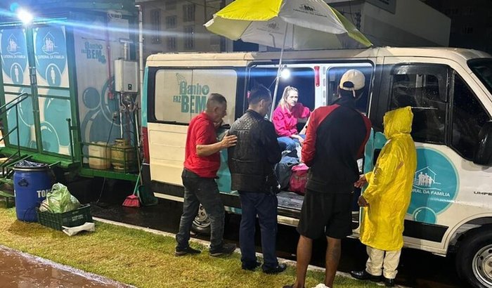 Como funciona o projeto? Utilizamos uma carretinha adaptada com dois banheiros equipados com aquecedores a gás, garantindo um banho quente e digno. Mas não paramos por aí: