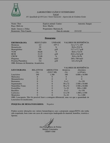 Como vocês podem ver acima, com o último hemograma que foi feito, Thor ainda está com taxas muito baixa e precisando de cuidados médicos.